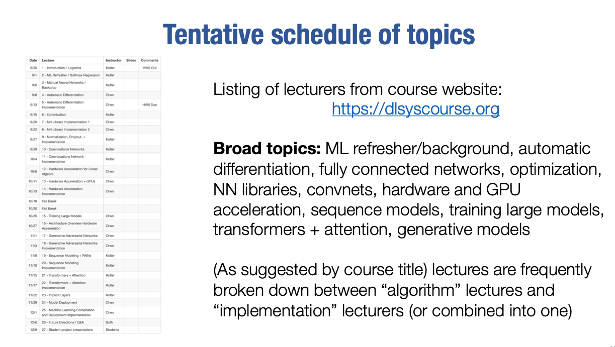 课程网站是dlsyscourse.org,上面提供了所有信息并会列出课程的所有讲座。你可以查看课程主题的时间表以了解你将学习什么。需要强调的是,这里列出的时间表至少是CMU课程的时间表,比在线版本提前两周。但我们将在在线讲座可用时发布在线讲座的日期和视频,并且它将遵循与CMU课程相同的结构。实际上,只有本讲座的幻灯片稍有不同,因为在线课程和CMU课程的日程安排有所不同。但除此之外,课程时间表将遵循CMU课程和在线课程之间相同的时间表,而时间表已经在网站上了。它介绍了一些主题,例如覆盖机器学习的背景和基础知识、自动微分、不同类型的架构等。你会看到很多讲座被分为算法讲座和实现讲座,算法讲座涵盖解决某个问题或实现某个深度学习任务的方法论算法或技术,而实现讲座则会实际实现一些部分或带领你进行一些简单的实时编码,以展示实践中的具体操作。