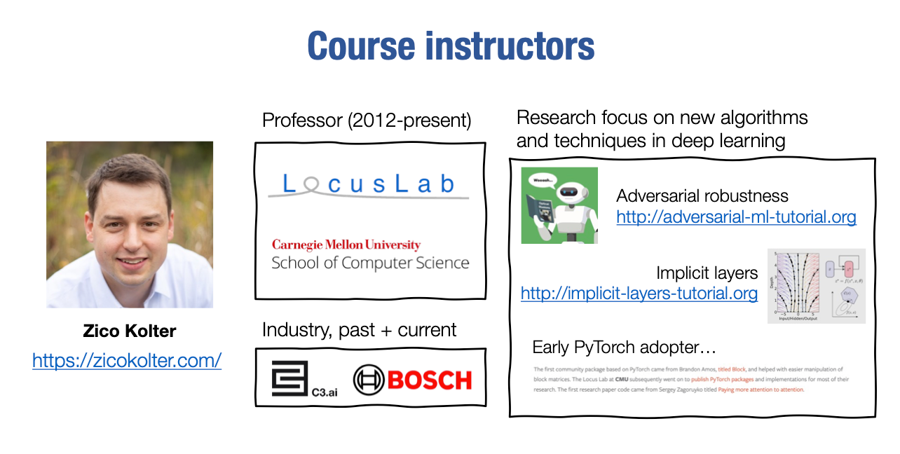 首先,让我来介绍一下我和我的联合教师天奇。我是卡内基梅隆大学的教职成员,自2012年以来一直在那里工作。除了在工业界或卡内基梅隆大学工作外,我还在工业界做了相当多的工作。我曾在一家叫做C3 AI的公司工作过。现在我是Bosch的首席AI研究科学家,在Bosch AI中心工作。我的学术研究重点是深度学习中的很多新算法和新方法。因此,我在对抗攻击的鲁棒性方面做了很多工作,尤其是针对对抗攻击的认证和可证明的防御措施。我也在所谓的隐含层方面做了很多工作,这些层不仅仅是通过一些传统操作的堆叠形成的,而是通过解决更复杂的运算符,如优化问题或不动点方程,来形成这些层,并且可以通过解析方式进行微分。事实上,按照当前的课程安排,如果有时间的话,我们将在这门课程的最后一节课上讲解隐含层的内容,当然,我们将使用我们自己的框架来实现。