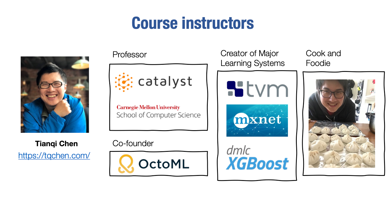 另一个教师有些不同。陈天奇也是卡内基梅隆大学的教职成员。除此之外,他还在工业界有所涉足,是OctoML公司的联合创始人,该公司现在为TVM库提供了很多支持和开发。但他真正引以为傲的是以下事情。所以我在这里给他做个介绍,以适当地让他有些尴尬。在深度学习系统或整个机器学习系统中,真正有三个大的领导者。当然,有Google发布的TensorFlow、JAX和许多其他库;Facebook的PyTorch,还有像时间序列库Prophet等;然后就是田奇了。田奇是XGBoost的原始开发者之一,这是最常用的梯度提升库之一,仍然是最广泛使用的表格数据库之一。他还是MXNet库的首席开发人员,这是另一个像PyTorch和TensorFlow一样的深度学习框架。最近,他还是Apache TVM库的创始开发人员和核心开发人员之一。所以他在整个机器学习系统中做了很多令人惊讶的事情,我非常高兴能够和他一起教授这门课程。