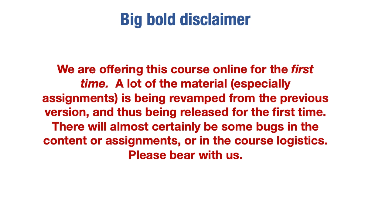但是,像往常一样,会有漏洞存在于内容、作业,或者只是我们运营事务的逻辑中。这是我们第一次在线上开设这门课程,肯定会出现问题,可能会有一些波折,希望大家谅解。