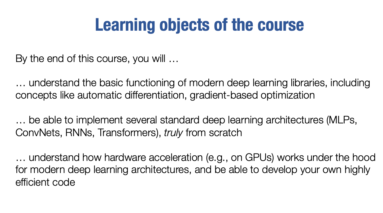 如果你完成整个课程,做完所有作业和最终项目,那么在课程结束时,你将了解现代深度学习库的基本功能,包括自动微分和基于梯度的优化等算法方面的概念。你将能够从头开始实现几种标准的深度学习架构,例如多层感知器、卷积神经网络、循环神经网络或长短期记忆网络、各种类型的RNN和变形金刚网络。你还将了解和实现硬件加速如何在底层工作,并能够开发自己高效的代码。