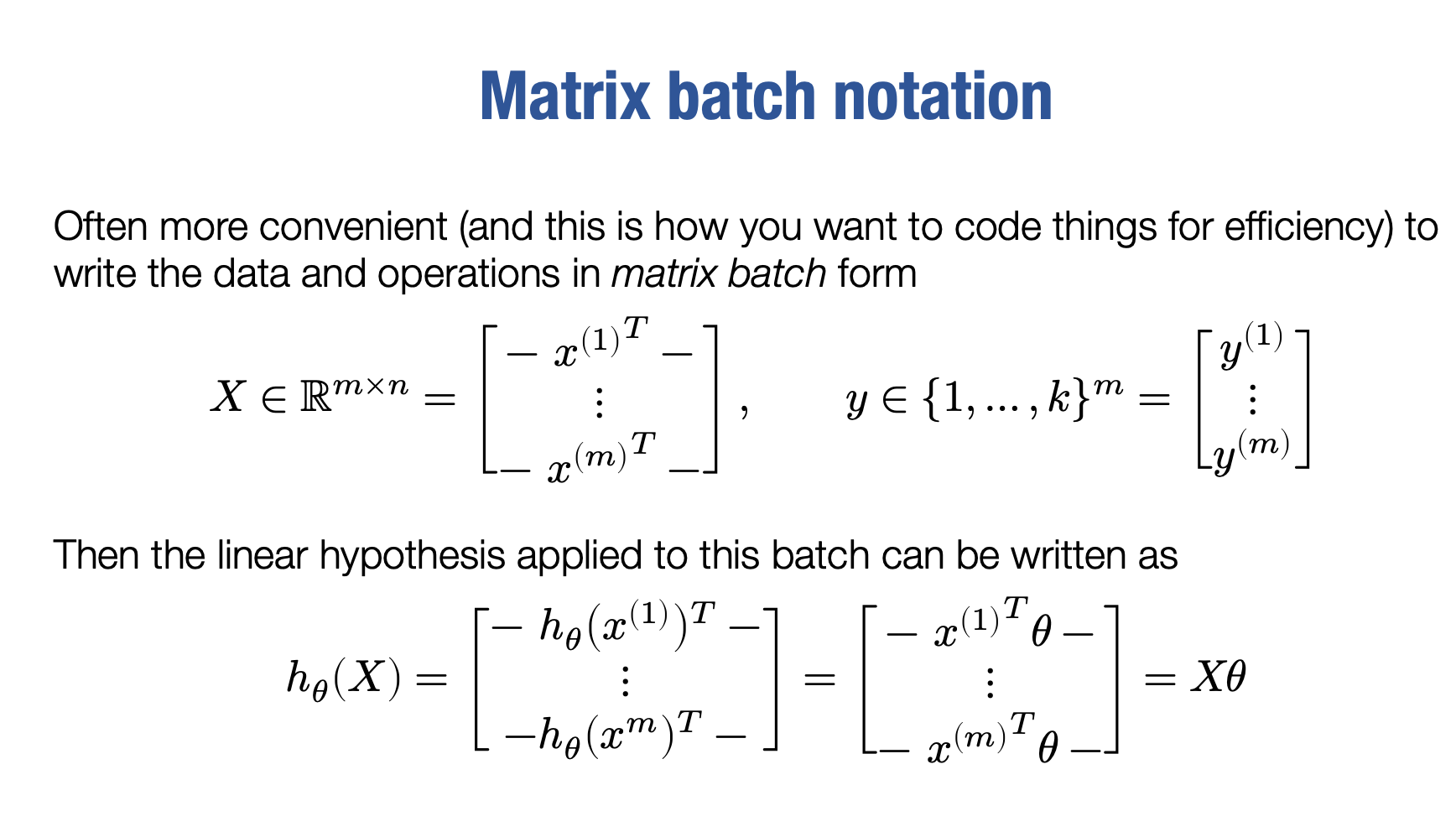 在许多情况下,我们将许多样本一次性输入到假设函数中会更加方便,而不是仅考虑单个样本。我们可以使用矩阵表示法来表示这些操作。实际上,这不仅是一种数学上的美学,也是在实现这些操作时非常重要的,因为矩阵运算比执行许多向量运算更有效率。因此,在代码中实现这些操作时,矩阵批量表示法不仅是一种优雅的表示方法,而且还是一种更加高效的实现方式。