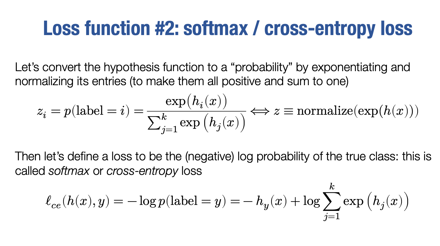 交叉熵损失已经成为大多数机器学习中的标准术语。因此,事实上,我们将定义它为交叉熵损失。为了定义这个损失,我们需要将我们假设函数的输出转换成概率的形式。