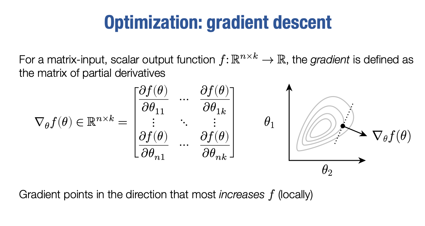 现在,这个梯度的好处是,它指向指向f(θ)最大增长的方向,这是一个非常强有力的概念。类似于在一维微积分中,导数等于该函数的斜率,那么在高维度中这就是梯度。如果θ是一个向量值,那么梯度将是一个向量。它指向f的最大增长方向,至少在局部范围内。通过一点微积分,你至少在局部范围内已经拥有了在参数空间中增加函数最多的方向,并且我们将会看到,通常存在计算梯度的有效方法。这是自动微分的内容,但我们可以非常高效地计算它。通过这样做,我们可以轻松地找出如何更改或优化我们的参数θ。