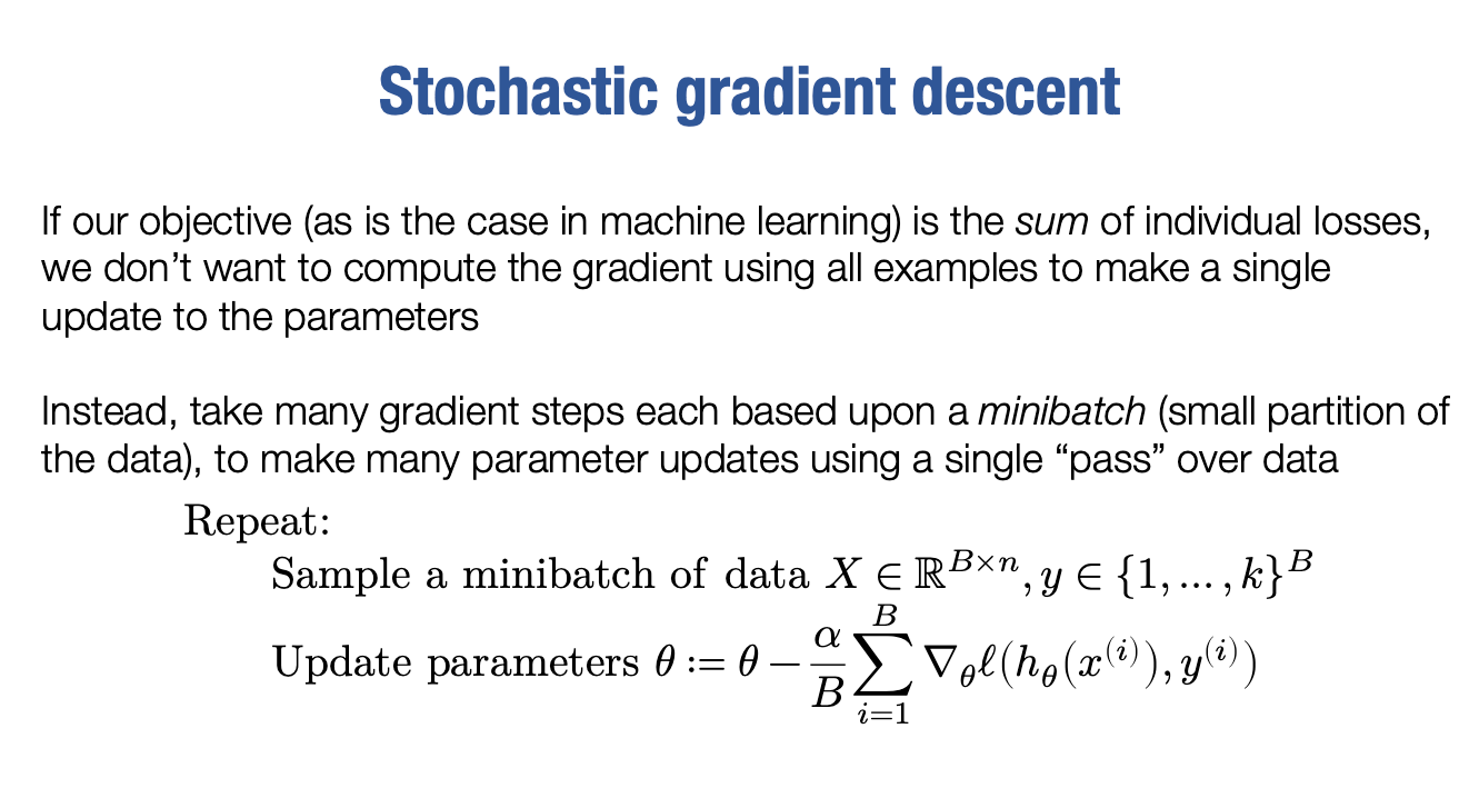 就好像我们的损失只是这B个样本一样。因此,要思考的方式是,我们在这里采取的每一步都只是对真正梯度的粗略近似,但是这会加速计算过程,实际上,在深度学习中甚至有时会有优势,因为我们通常会有一些噪音,实际上在某些情况下会有所帮助。