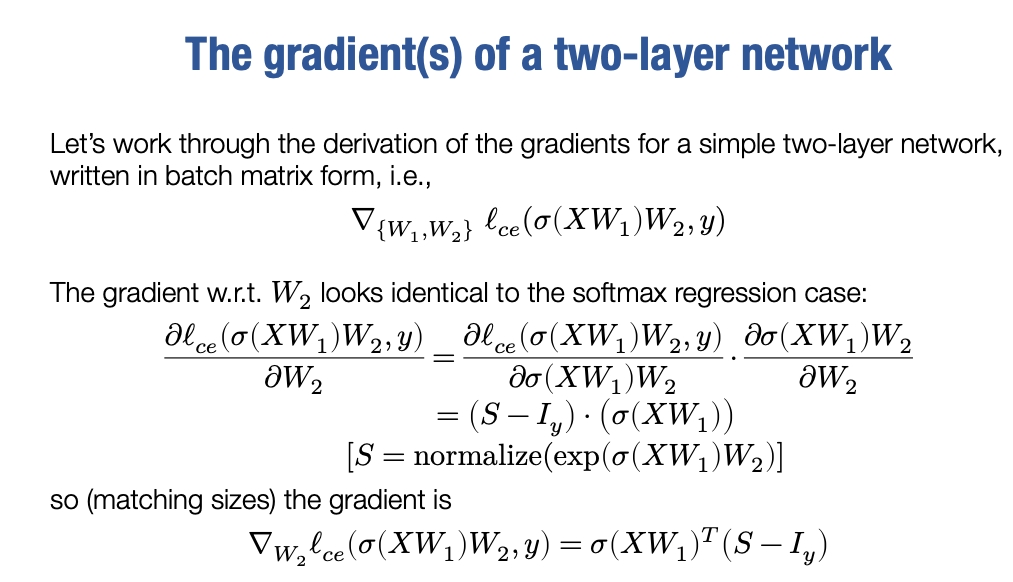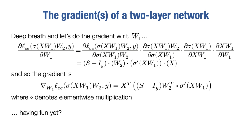 实际上,这就是多层神经网络的通用反向传播的真正矩阵形式。我认为公正地说,大多数讨论反向传播的机器学习课程通常就到这里。他们会讲解如何推导反向传播,也许还会谈到卷积,但他们甚至不会详细讲解如何为卷积推导反向传播。他们只是讨论卷积的前向传播,并假设一切都能解决。当谈论实际的反向传播时,大多数课程在那里结束,甚至可能连矩阵形式都没有涉及,但对于我们来说,这只是一个开始。实际上,在本课程的后续内容中,我们将不再使用这种方法。
