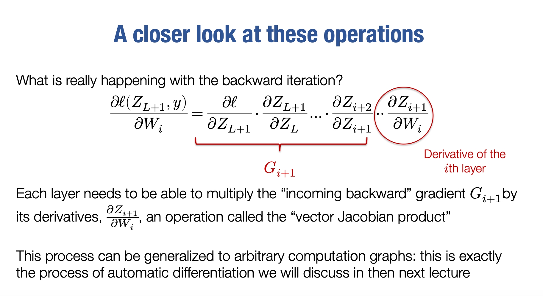 一般来说,为了适应反向传播框架,任何层都必须能够将传入的反向梯度与自己的导数相乘。实际上,这是一个非常常见的操作,有自己的名称,被称为向量雅可比乘积。这个术语实际上很误导人,因为G_i实际上并不是一个向量。但它的真正意思是,如果你将整个事物看作一个向量,并将这个事物看作多元微积分中的雅可比矩阵,那么将这个东西乘以这个东西的操作就被称为向量雅可比乘积。非常有趣的是,这个过程可以变得更加模块化和通用。