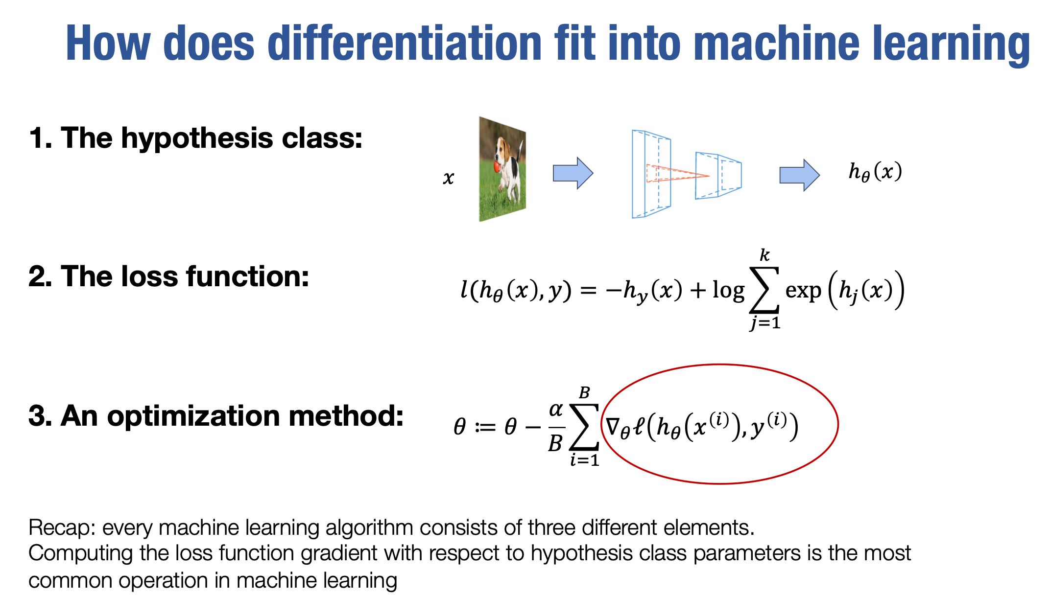 那么我们从第一个开始。自动微分如何适用于通用的机器学习工作流程呢?如果回想前两节课,我讲述了机器学习的基本要素,或者你可以考虑机器学习算法。通常情况下,我们需要从几个角度来思考。首先,我们需要考虑假设类别(hypothesis class),也就是针对给定的输入x,如何得到预测值。在前几节课中,我们讨论了多层感知机和单层感知机算法作为正常情况下的假设类别。在接下来的讲座中,我们将讨论不同的假设类别,如卷积神经网络(convolutional neural networks),Transformer和generative neural networks,它们可以将给定的输入转换为预测。当然,对于给定的假设类别,仍然有一些未确定的因素,具体而言,每个假设将由一组参数θ进行参数化,我们需要从训练数据中学习一个好的θ。因此,机器学习中的第二个要素通常是损失函数。损失函数定义了对于给定的假设类别和参数θ,我们的预测有多好。通常情况下,我们使用训练数据集来衡量。因此,我们将试图找到一组θ,使训练数据集上的损失函数最小化,然后我们将使用学习到的参数θ来对未来的数据集进行预测。损失函数是衡量我们的模型性能的元素。最后,对于给定的损失函数,我们仍然需要能够找到一个优秀的θ,使得损失函数最小化。这就是第三个角度的作用,也就是优化方法。大多数机器学习优化算法实际上都采用随机梯度优化的形式。我们会尝试计算损失函数相对于参数θ的梯度。梯度函数是一个指导方向,通常它会使损失函数稍微增加一点,我们的目标是减小它,对于小步长,我们会朝负梯度方向迈出一小步。我们使用的大多数方法通常也被称为随机梯度方法,这意味着我们不是尝试计算整个数据集上的梯度,而是从数据集中选择一个小批量样本,然后直接朝着该小批量上计算的梯度方向迈出一小步,这通常被称为随机梯度方法(stochastic gradient method)。