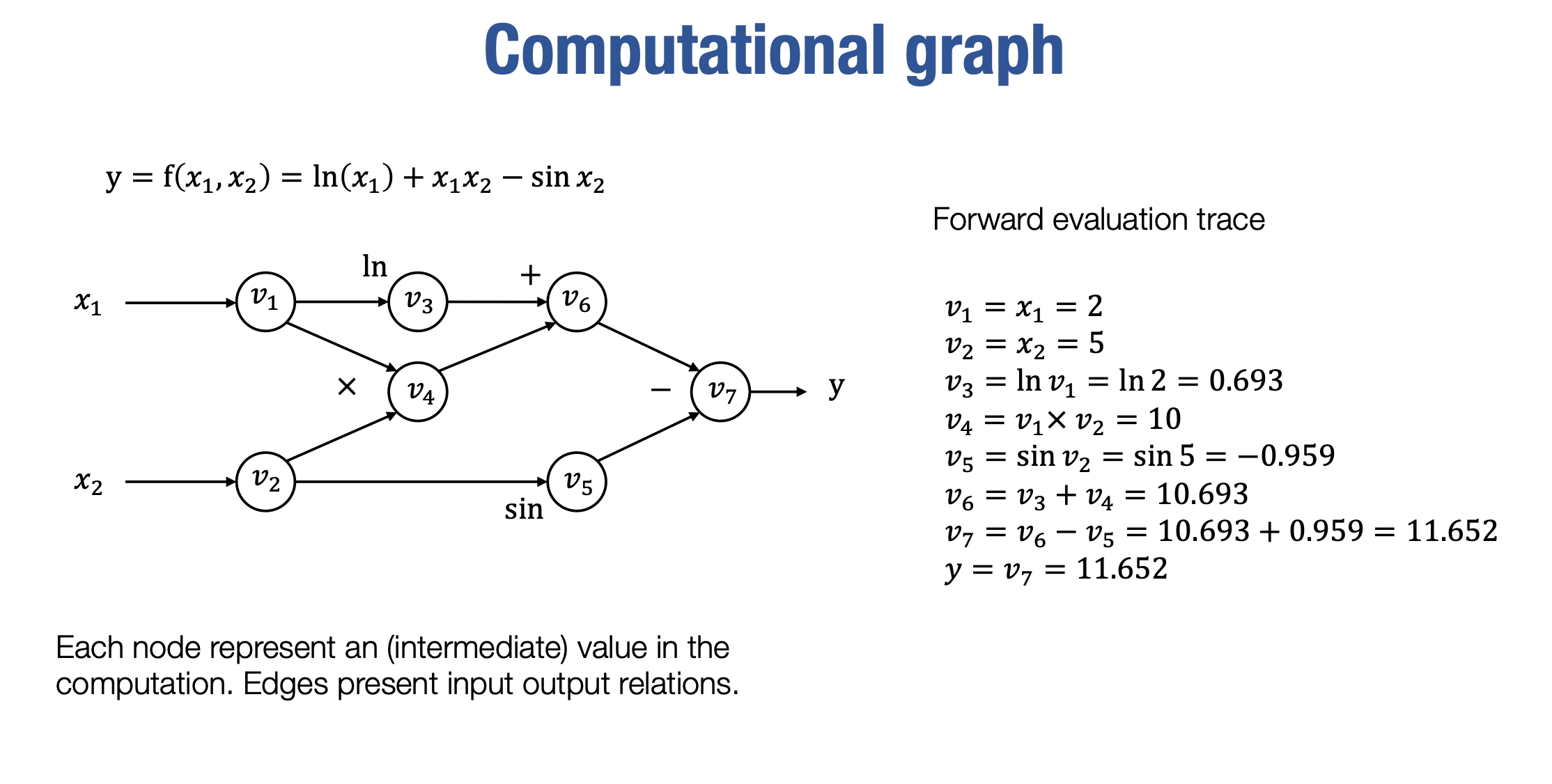 计算图几乎是所有机器学习框架的核心,对于我们推导自动微分方法来说,它也是一个重要的工具。实际上,计算图是一个用于表示对某个函数进行计算的有向无环图(directed acyclic graph)。例如,silde展示了一个表示特定计算的计算图。