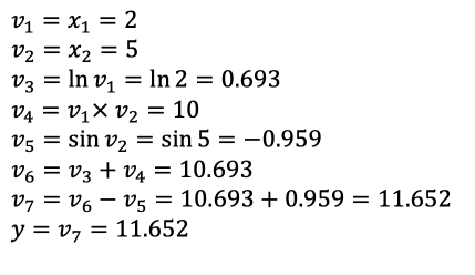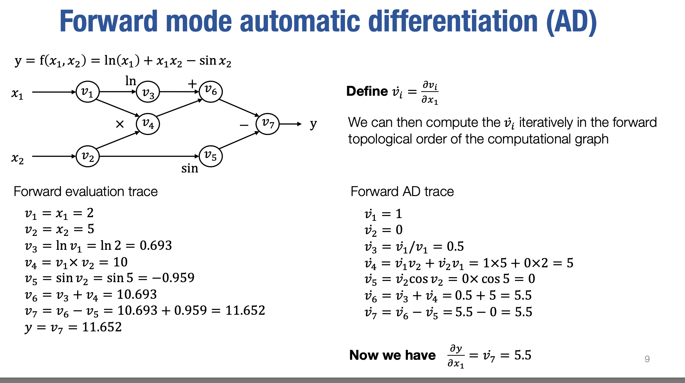 最后,我们可以发现,在遍历完计算图中的每个节点之后,我们将得到v˙7,即最终节点x1的偏导数。