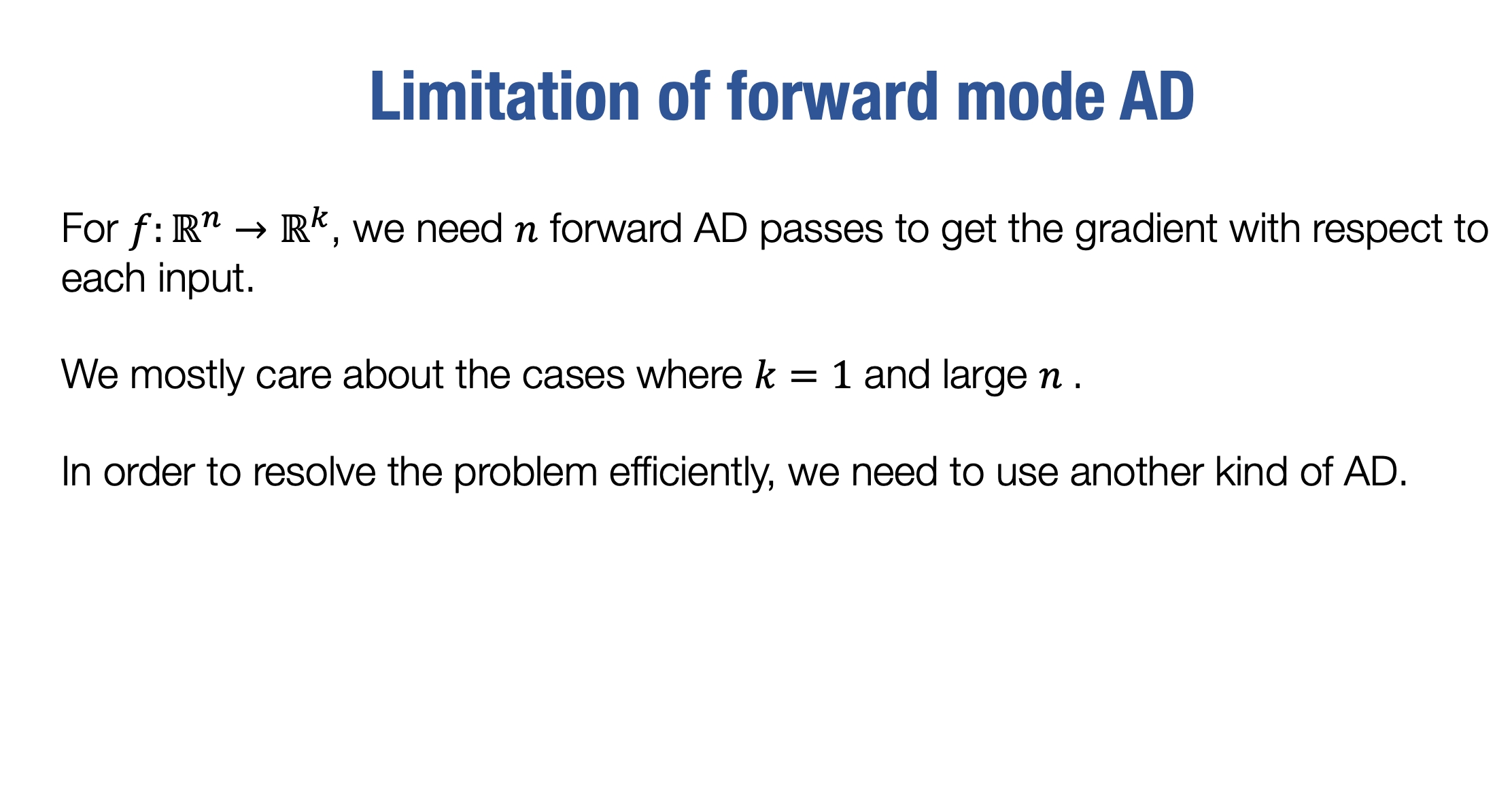 另一方面,如果你想计算神经网络的梯度,你会发现前向模式自动微分仍然存在一些限制。