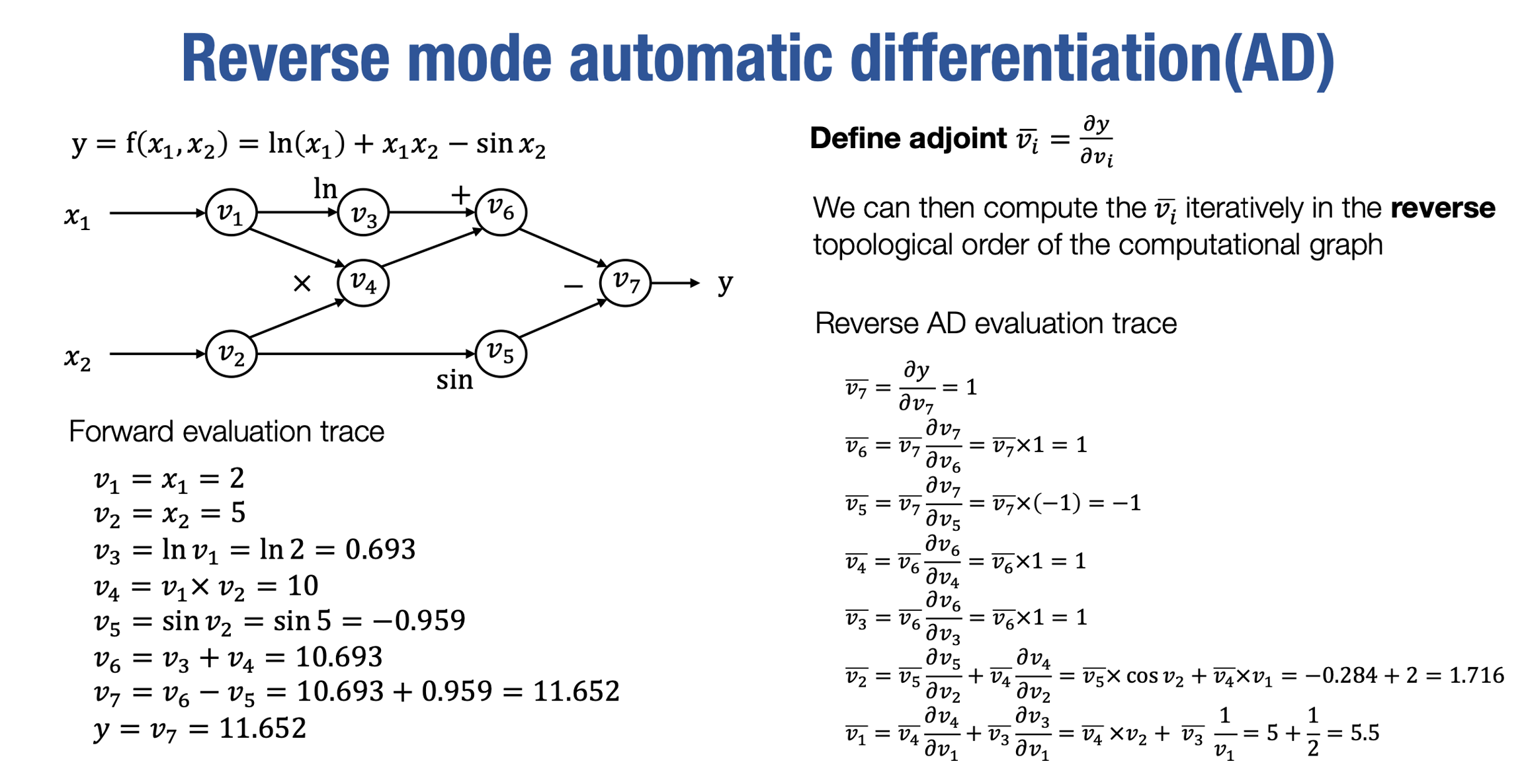 总结一下,通过定义adjoint值,我们可以从最末端递归地推导出每个计算图节点的adjoint值。我们从v7开始,因为该节点的adjoint值是微不足道的,即等于1。然后,对于每个节点,我们可以通过其下一个节点的adjoint值以及该输出节点对输入的偏导数来推导出adjoint值。