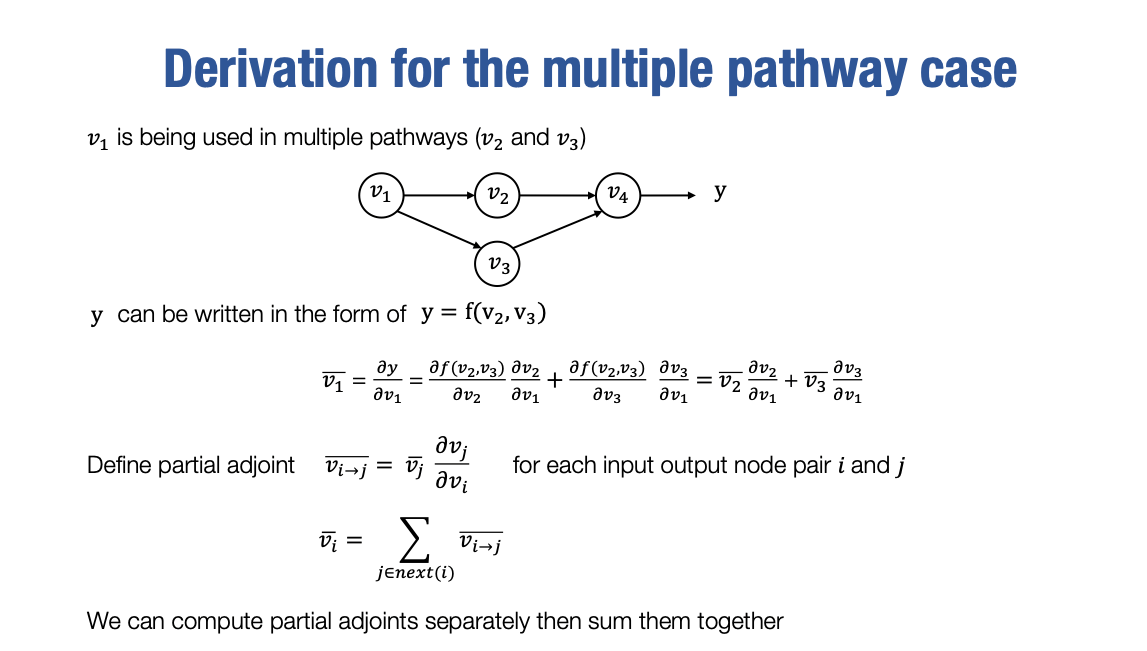这就是正式的推导过程,它有点像你在微积分中学到的偏导数计算规则。因此,最终的v1的adjoint值将成为所有这些输出的adjoint值乘以相应输出对于输入节点v1的偏导数的和。