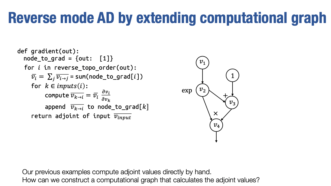 这就是反向模式自动微分的实现。接下来,我将告诉你一个这个实现的变种,在我继续之前,我希望大家稍微停下来思考一下,你可能想要如何实现这个算法,特别是你会使用什么样的数据结构来表示vˉi和vi→j 。在这种情况下,一个自然的答案,可能是使用多维数组来存储这里的特定计算结果,这是一个非常合理的答案。