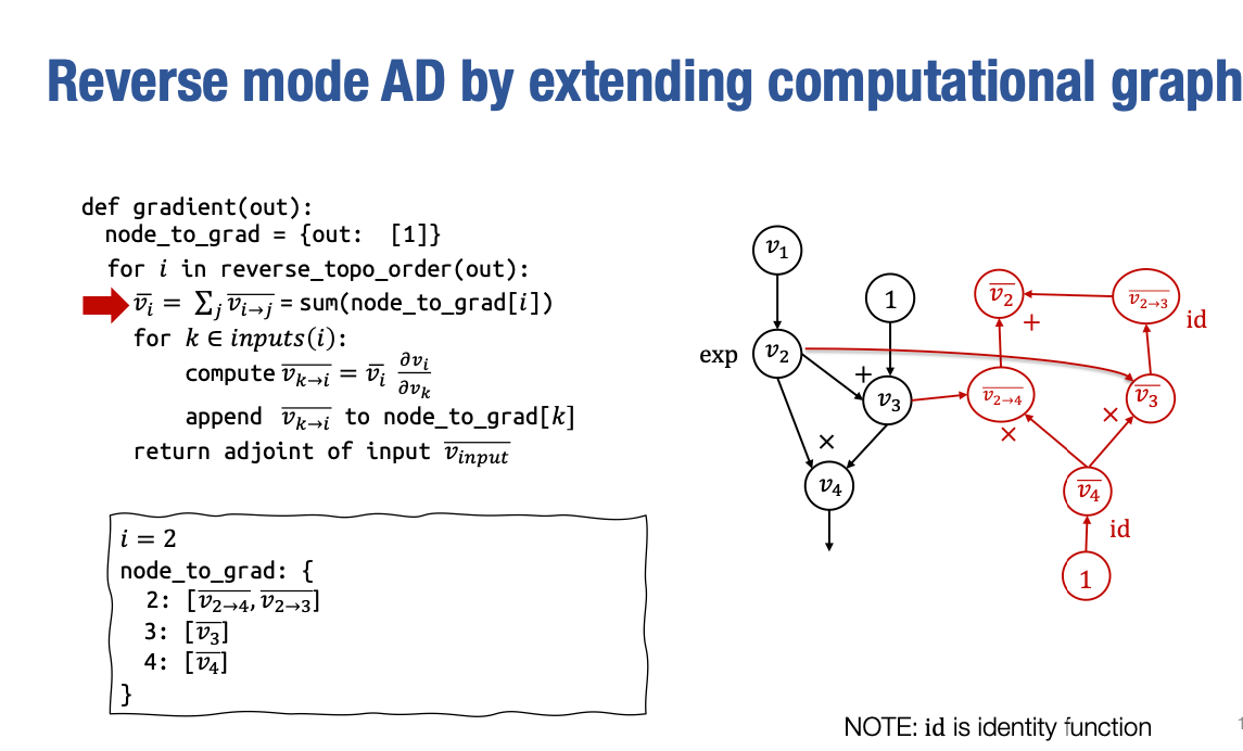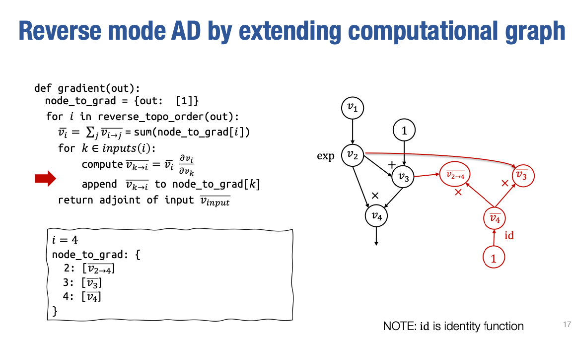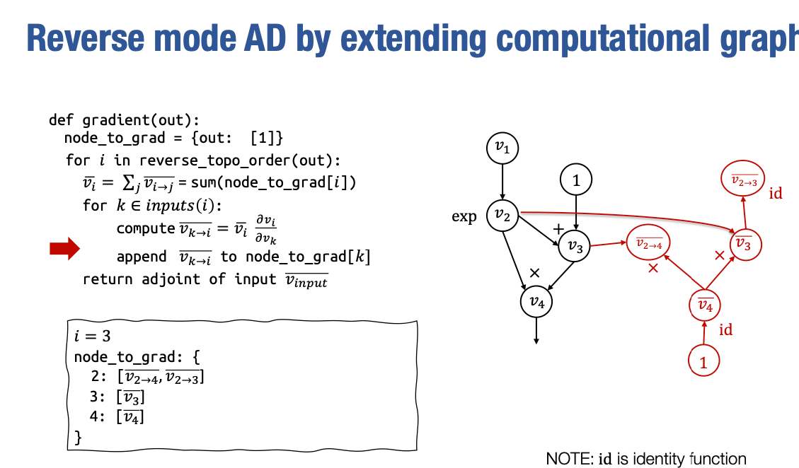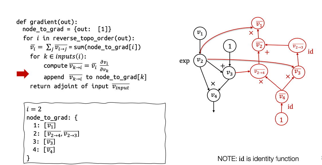 得到 vk→i ,然后我们将这个 partial adjoint 追加到 node_to_grad[k] 的值中,然后我们将在这里重复这个循环。