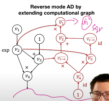 因此,通过将v1→2和v1→3相加,我们可以计算vˉ1。这符号表示对于我们正式编写自动微分算法和实现时非常有帮助。好的,到目前为止,我们已经手动推导了自动微分。可以看出,通过计算图和adjoint的定义,我们能够通过反向遍历计算图以递归的方式推导出中间梯度。