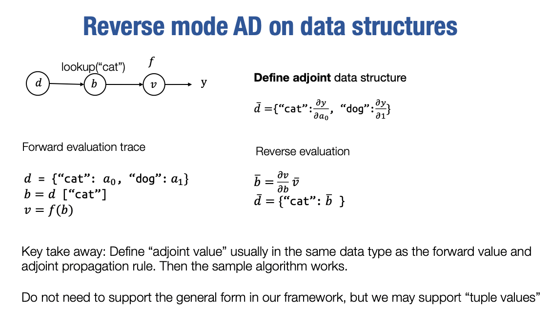 所以最后,这是一个额外的幻灯片,我们已经讨论了逆向模式自动微分在张量上的应用。然而,当我们编写程序时,并不是所有的中间值都是张量。有时候我们可能想要将张量放在数据结构或其他形式中。例如,我们可以有一个字典,其中字典的每个值对应于我们想要相对于其进行微分的张量。实际上,我们可以将伴随的定义推广到这些数据类型和数据结构上。当然,我们可以推广定义。例如,在这种情况下,对于字典,我们可以通过确保字典键本身始终不是张量来推广定义。因此,它始终是一个我们可以相对于其进行微分的值,但其值可以是张量。我们可以将伴随定义为另一个字典,其中包含相同的键集,但值对应于相应的伴随值。因此,对于每个前向计算,比如字典查找,我们将能够定义一个反向计算梯度计算,其有效地构造另一个包含伴随值的字典。这里的关键是,对于不同的数据类型,只要我们可以为伴随值和伴随传播规则定义一个定义,我们就能够定义伴随计算。相同的逆向模式自动微分算法应该适用于这些情况。这是一种更一般的情况,称为可微编程,我们不会在本讲座和课程中涵盖这个概念。如果您对这个概念感兴趣,欢迎您搜索与可微编程相关的文献,您可以找到一些相关的资料。我们可能希望在作业中支持某些类型的数据结构。具体来说,我们可能希望为元组值添加支持,这意味着我们希望支持包含多个张量元组的值,并且我们希望能够为该特定元组值定义伴随值。因此,这将成为我们作业实现的一部分。感谢大家参加今天的讲座。在今天的讲座中,我们学习了为什么要进行微分以及一套工具,使我们能够同时检查自动微分实现的梯度以及实现逆向模式自动微分,以便我们可以在一次反向传递中获取所有输入的梯度值。最后,我们还讨论了如何通过扩展计算图来构建逆向模式自动微分算法,以便我们可以使用相同的工具来获得梯度的梯度,并在低级优化方面